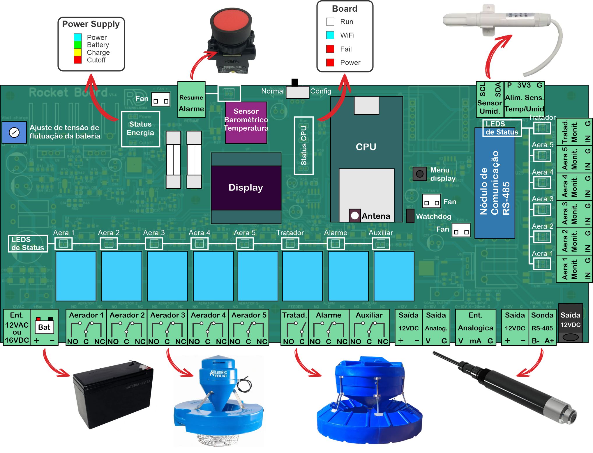 RocketBoard faz a automação de aeradores e tratador com base em programação e/ou qualidade da água. Projetado para dar eficiência no cultivo de peixes e camarões.